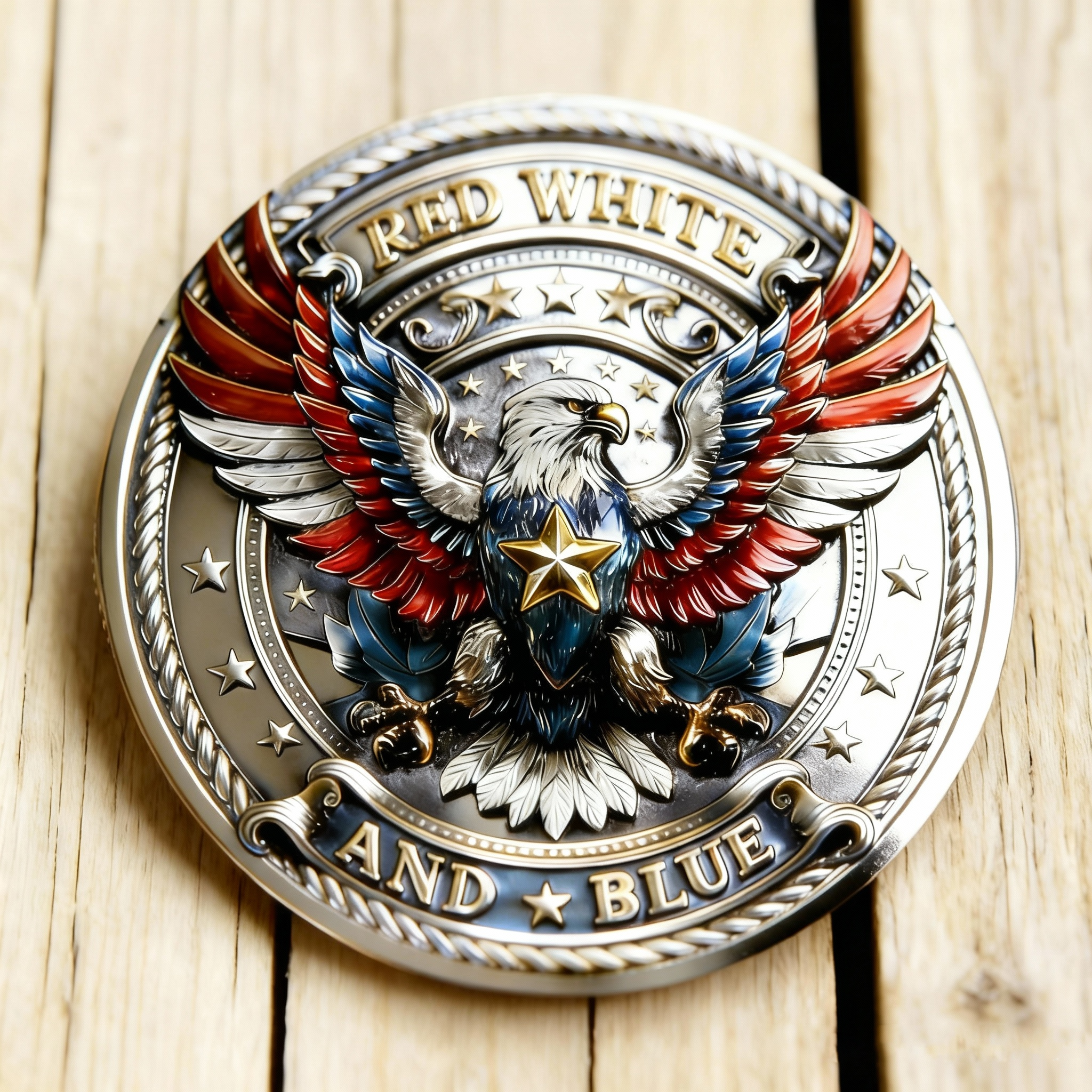 The front features a majestic bald eagle with wings spread wide, rendered in striking red, white, and blue enamel. The eagle symbolizes strength, courage, and independence, while the star at its center represents unity and hope. This bold design captures the heart of American patriotism.